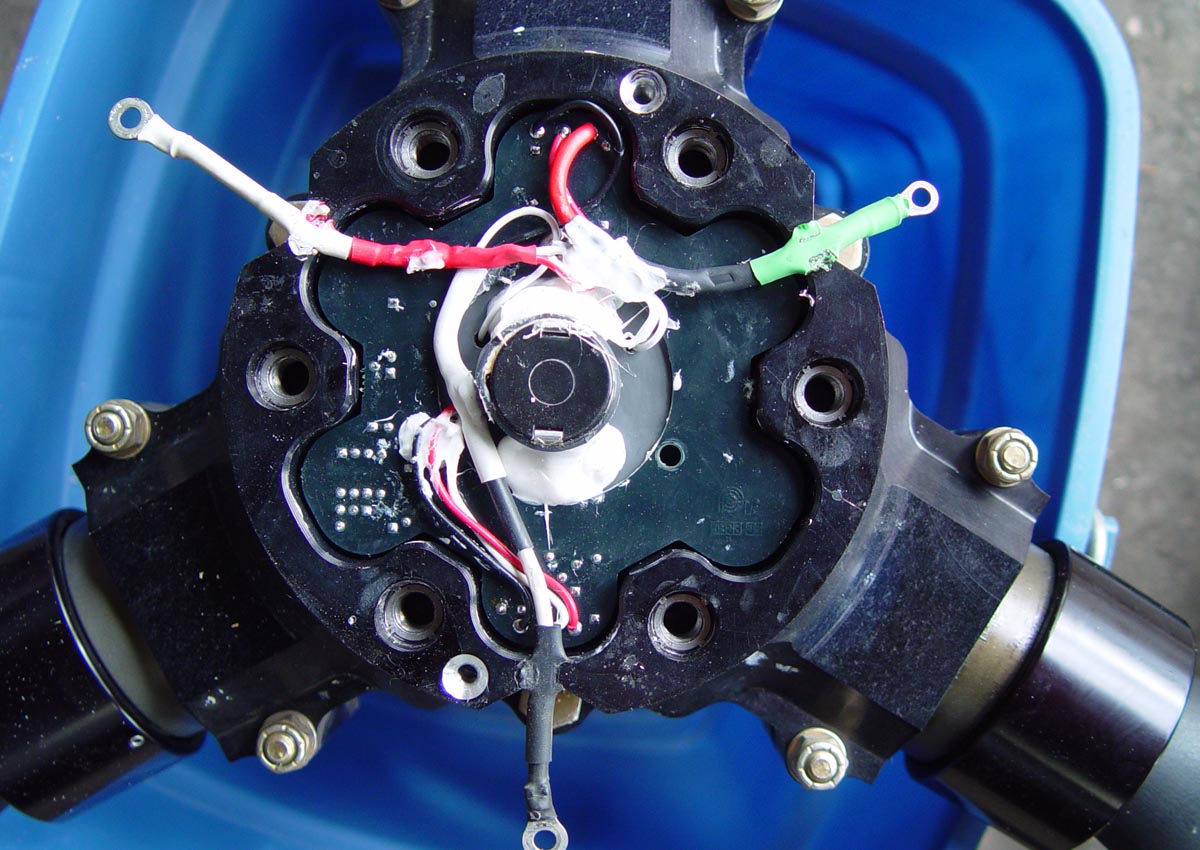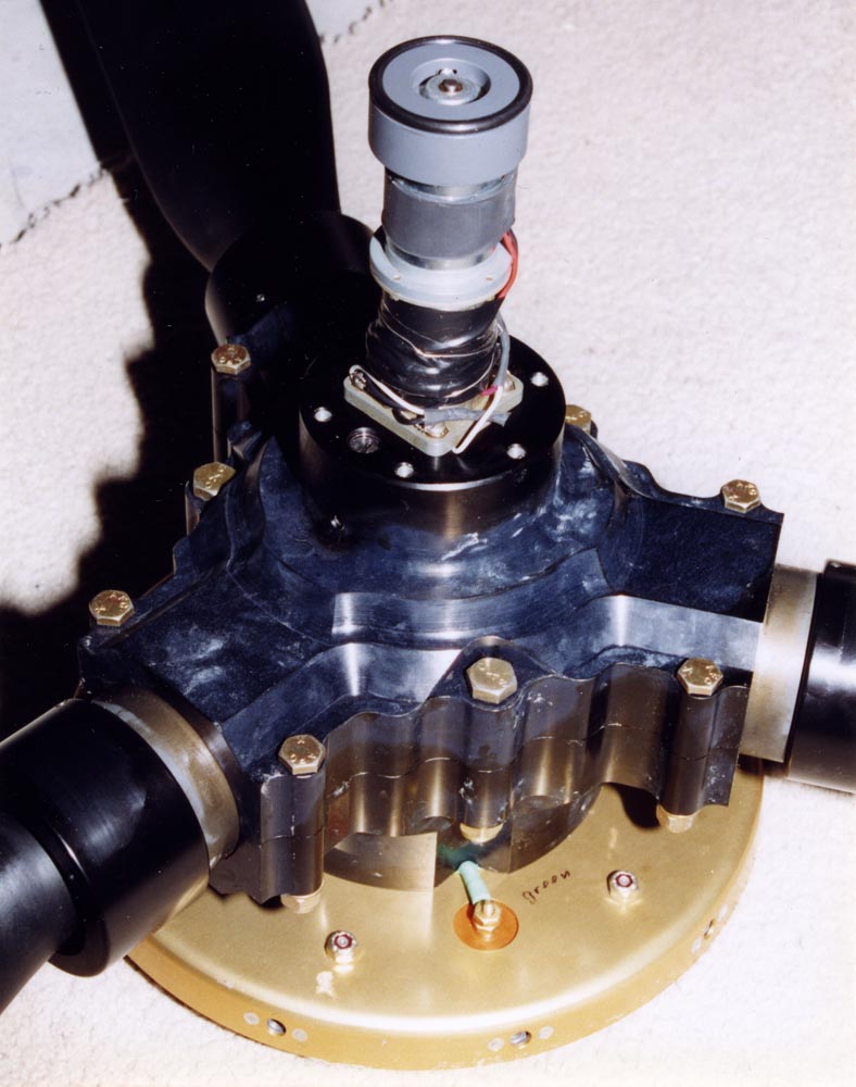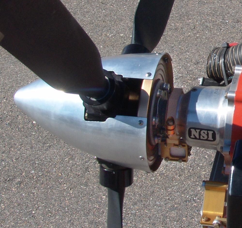 The propeller hub houses a geared electrical servo motor that adjusts the pitch of the propeller. The pitch can be run from +27 degrees to -27 degrees. The option of negative pitch was chosen to have the possibility of operating the Kitfox on floats. The gear shaft drives a potentiometer which sends a coded signal through the commutator rings to the cockpit control unit. |