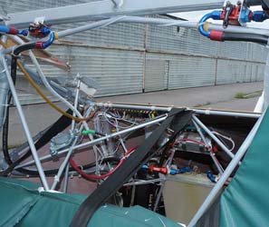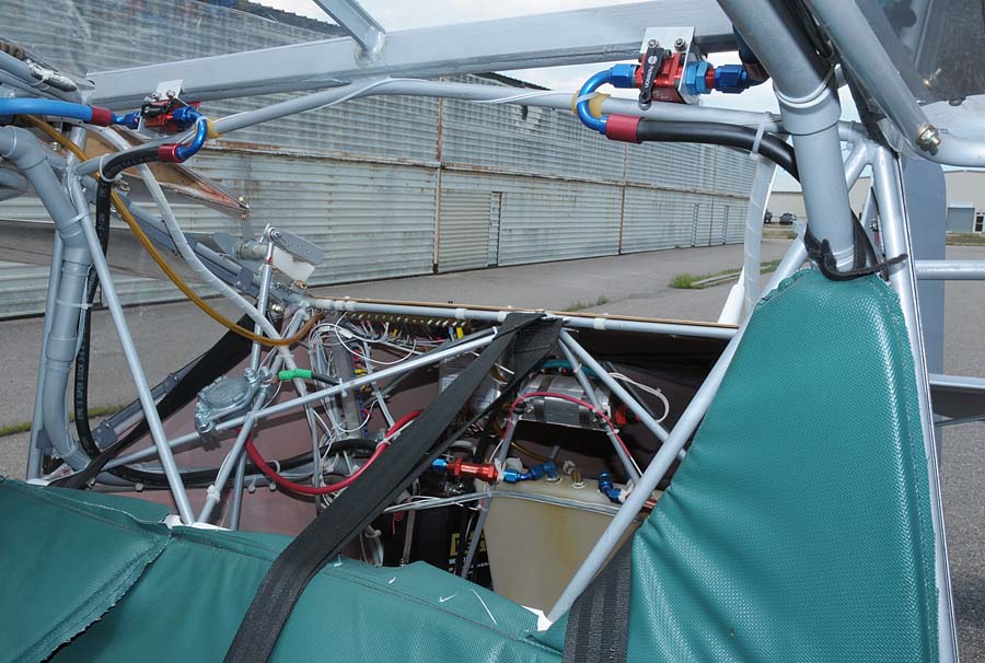 The area behind the seat is holding the fuel header tank (for about 20min of flight), the two batteries and the input for external power. Over the head are the individual fuel selector valves for each wing tank. There is still some room left for a storage bag behind the seat in order to free up the cockpit from little used equipment like tie down ropes etc. |