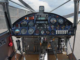 The front shows the impressive panel with the information necessary for navigation and engine control. The center console holds some of the less vital controls, such as trim, flap and main fuel shut off lever. The top of the control sticks have buttons to control the electrical trim servo and the pitch of the propeller. |
