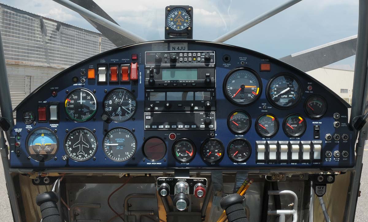 As normal in aircraft of this type the cockpit is rather limiting in placing all the instruments and controls one wants to have available and at the same time can be accessed without major contortions. Being used to an elaborate panel I tried to use the space available to it's max. At that time the complex Multi Function Displays were just appearing on the market and since I was not sure about the compatibility of interfacing with the sensors supplied by NSI I turned to the old standard displays which in our view go well with this type of aircraft. |